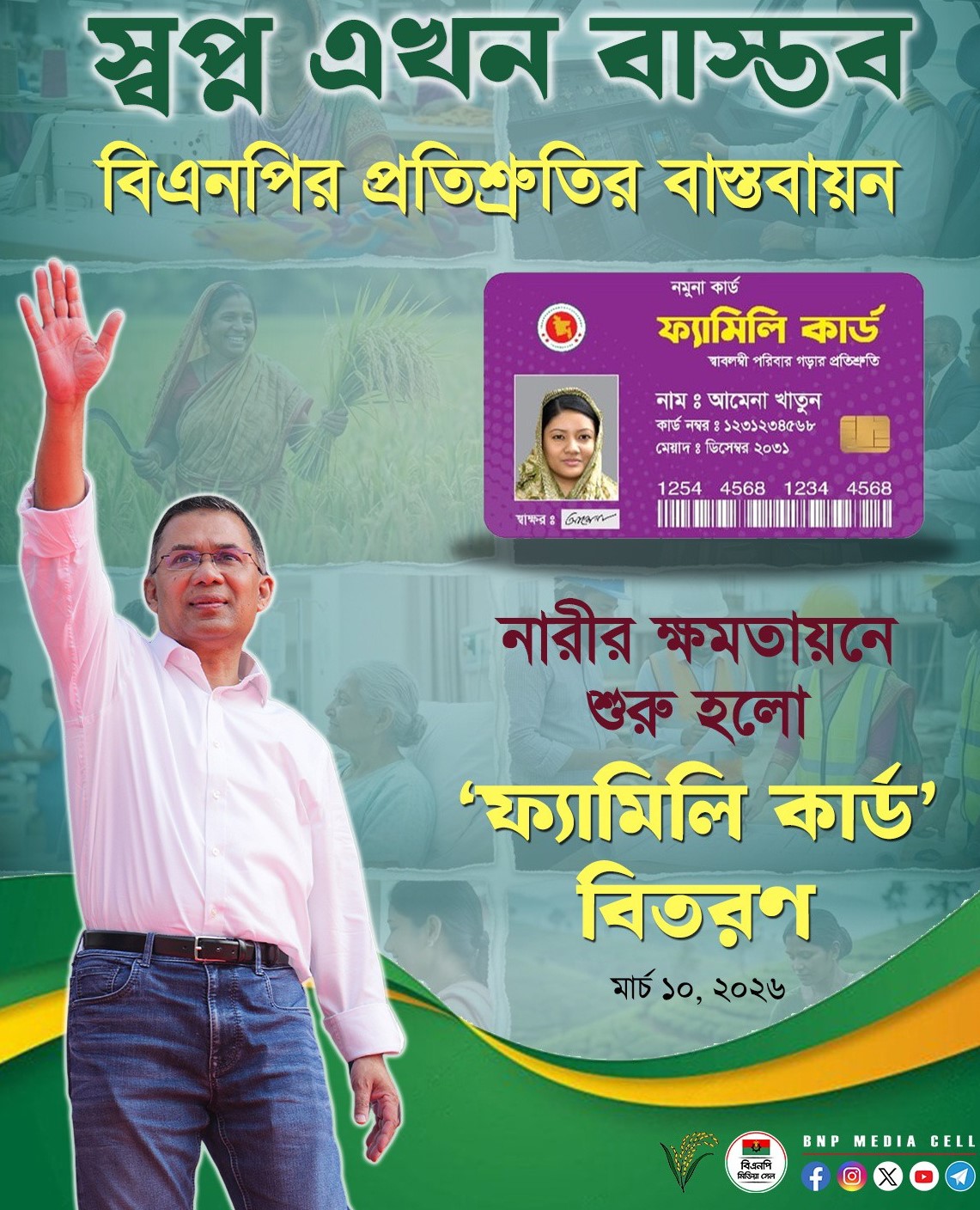 ‘ফ্যামিলি কার্ড’ কর্মসূচির উদ্বোধন করে প্রধানমন্ত্রী তারেক রহমান বলেছেন, কড়াইল, ভাসানটেক ও সাততলা এলাকায় প্রায় ১৫ হাজার নারীকে ফ্যামিলি কার্ডের সুবিধার আওতায় নিয়ে আসা হয়েছে। আমি দৃঢ়ভাবে বিশ্বাস করি আমার সরকার পর্যায়ক্রমে বাংলাদেশে যে ৪ কোটি পরিবার রয়েছে, তাদের কাছে আগামী ৫ বছরে এই ফ্যামিলি কার্ড নিয়ে যেতে সক্ষম হবো। জনগণের সমর্থন নিয়ে সরকার গঠন করার এক মাসেরও কম সময়ের মধ্যে জনগণের কাছে দেওয়া প্রতিশ্রুতির কাজ শুরু করেছি বলেও উল্লেখ করেন তিনি।